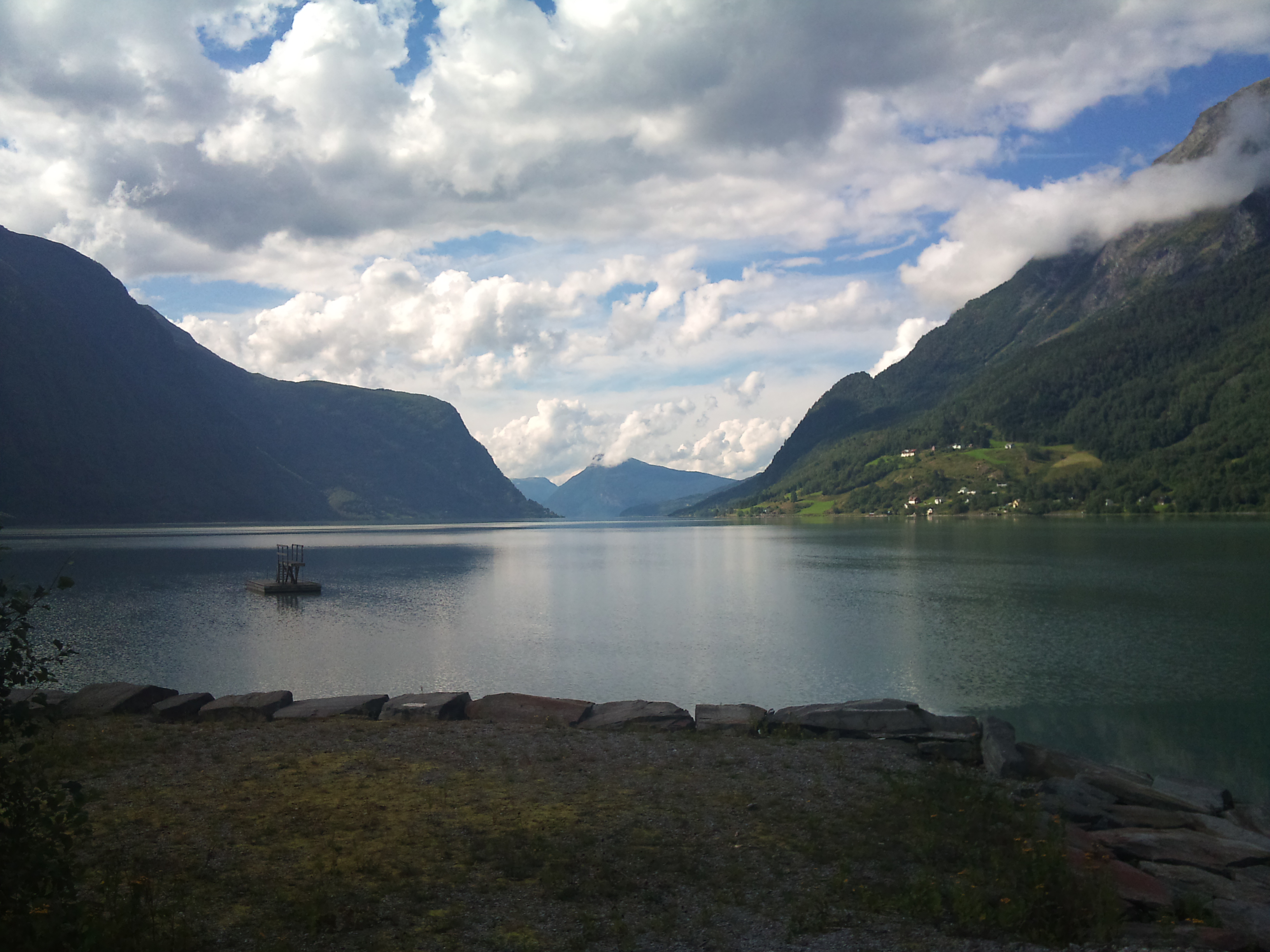 Treretters middag i en varm stue er fantastisk i over 2000 meters høyde når vinden hyler og nedbøren slår mot vinduene. Det sies at det er overskyet på toppen her 300 dager i året, slik var det også når vi gikk til bords. Utover middagen stilner vinden, og med ett så slår solen igjennom og et fantastisk skue åpner seg opp. Alle til middag løper ut og får med seg åpningen. Ett kvarter etter lukker hullet seg igjen, og showet er over. Et av de mest fascinerende synene her er utsikten ned i Årdal, og det jeg mener er fjorden. Her har vi altså utsyn ned de 2000 høydemeterne vi er ute etter.